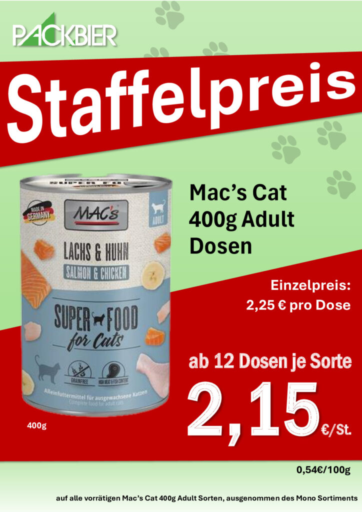 Gültig für das gesamte vorrätigeMAC’s Cat 400g Adult Sortiment, ausgenommen der „Mono“ Schiene.